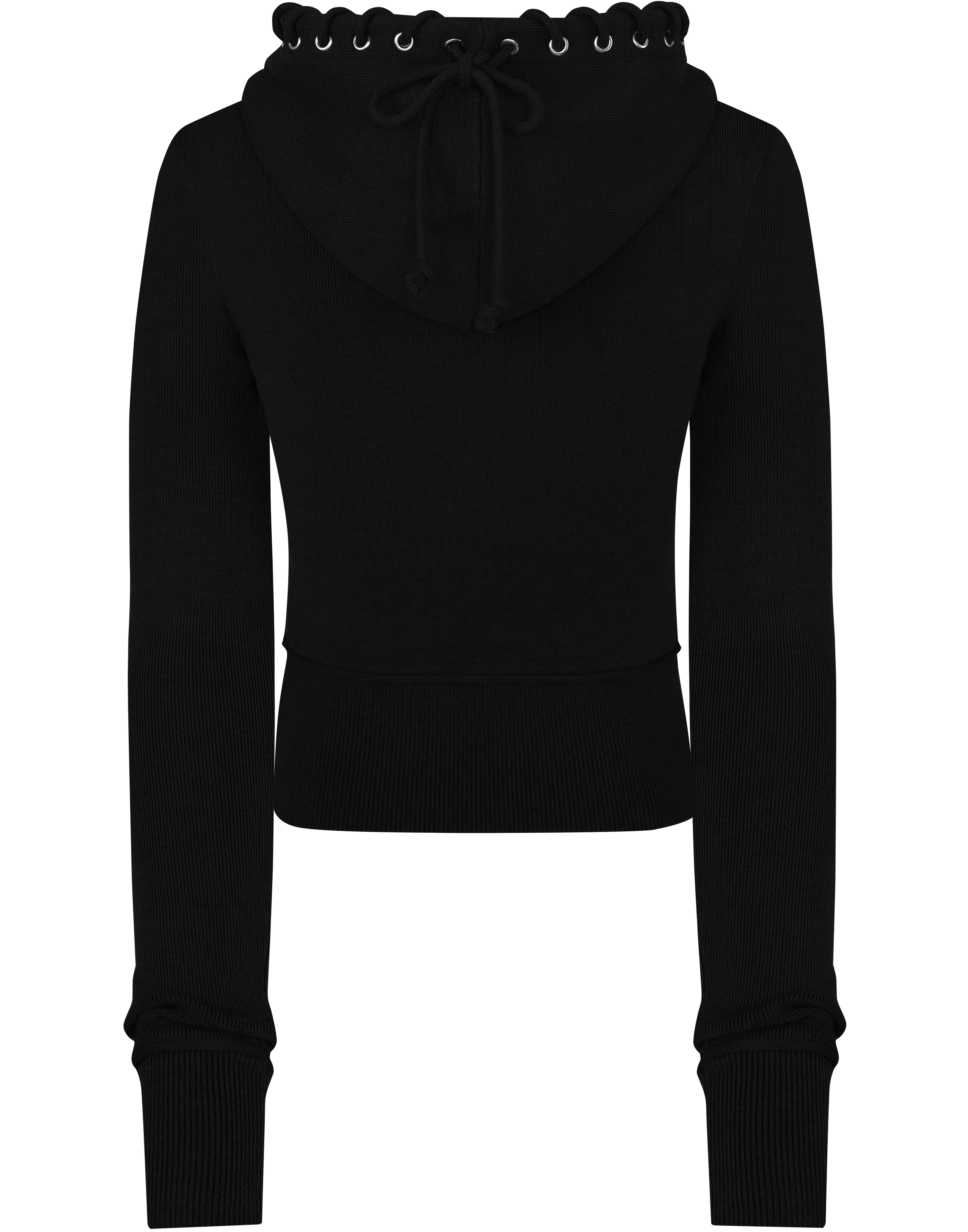 Original design by HIDDEN CULT®. This set is crafted from a medium-weight, ultra-soft, and highly stretchy knit fabric made from our custom "Jet Black" black yarn. Designed with a new enhanced fit, it features subtle branding, including brushed matte silver hardware and a hand-sewn, logo-engraved metal badge on both the zip hoodie pocket and pants. The zip hoodie is detailed with a custom-engraved puller on the front opening. Each 2-piece set showcases 3D knit detailing, a tall-friendly fit (please refer to the size guide), mid-rise pants, and a newly redesigned form-fitting zip hoodie with "Wynn" cotton cord lacing carefully threaded through the hood. Buttery soft with eye-catching details, this set is made to hug your curves with all-day comfort.